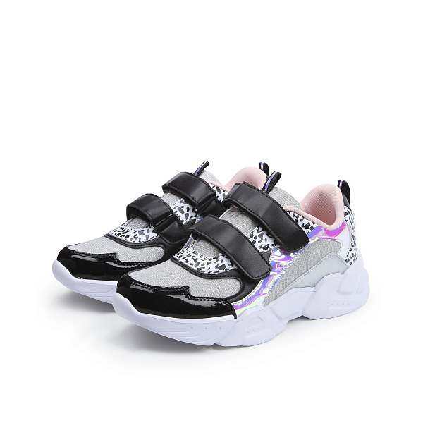 Комбинированные спортивные полуботинки сочетают в себе материалы разного цвета и фактуры. Кожа с матовой, лаковой, перламутровой поверхностью, окрашенная в черно-белый и оттенки розового будут чудесно смотреться на девочках школьного возраста. Для обеспечения вентиляции стопы использованы приятные на ощупь текстильные сетчатые вставки. Две комфортные застежки-липучки сделают обувание легким и быстрым, а также плотно фиксируют обувь на ноге. Высокая подошва из пористого полимерного материала придает модели привлекательный вид. Подкладка обуви изготовлена из мягкого флиса, а стелька отделана материалом с содержанием хлопка 80%. Хлопок дарит сухость и тепло ногам, а также дарит чувство комфорта в течение дня.