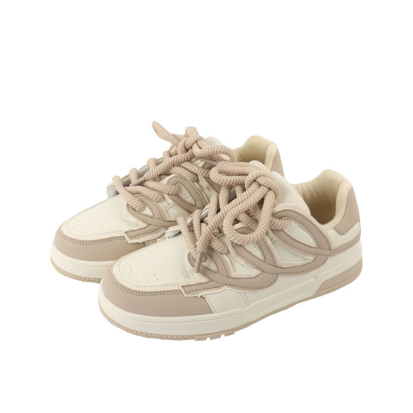 Элегантные детские полуботинки спортивного типа для девочек школьного возраста выполнены в стильном бежевом цвете с белыми вставками. Верх обуви изготовлен из искусственной кожи, что гарантирует долговечность и простоту в уходе. Полуботинки оснащены широкими бежевыми шнурками, которые надежно фиксируют ногу и подгоняют обувь по ноге.