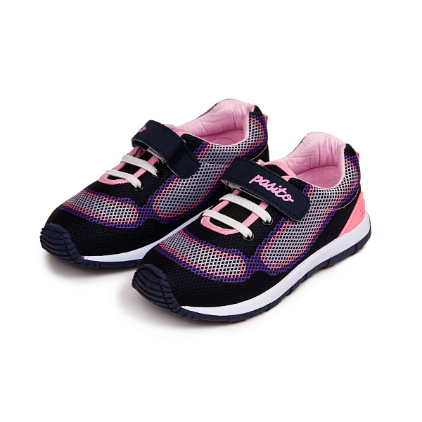 Дышащие кроссовки из специальной сетки в оригинальном разноцветном оформлении подойдут для занятий спортом и активными играми в помещении и на улице. Дизайн кроссовок похож на взрослый. В дизайне использованы темно-синий, фиолетовый, розовый и белый цвета. Ботинки дополнительно оснащены прорезиненными вставками с воздушными каналами в задней части.