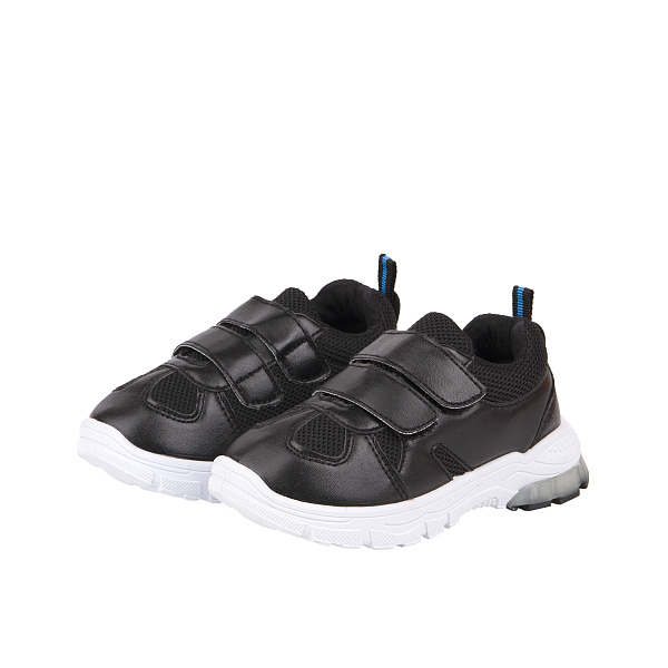 Стильные черные кроссовки для мальчиков имеют волшебный секрет: встроенные в подошву в области пятки светодиоды обеспечивают яркое и красочное свечение разными цветами. Это не только станет веселым развлечением для ребенка, но и сделает его более заметным в темное время суток на улице.