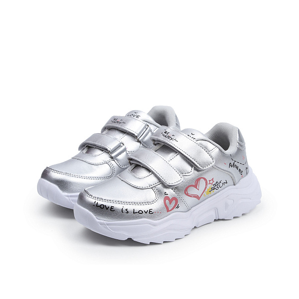 Спортивные летние кроссовки для девочек дошкольного возраста оформлены в серебристом цвете и декорированы принтом в стиле граффити. Модель понравится детям младшего возраста, потому что она легко обувается и фиксируется при помощи застежек-липучек. Верх обуви изготовлен из кожи с высокими показателями износоустойчивости. Подкладка выполнена мягким флисом из синтетического волокна. Высокий устойчивый протектор с выраженным противоскользящим рисунком делает модель модной и современной. Подошва немного заходит на носок, увеличивая прочность модели. Подкладка подошвы и стелька имеют эргономичную форму, позволяющую распределить вес тела при ходьбе. В такой обуви ноги ребенка меньше устают.