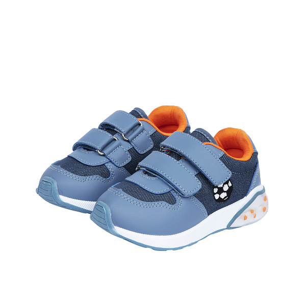 Стильные полуботинки сделают легкими первые шаги маленького мальчика. Модель оформлена в серо-голубой цветовой гамме, дополнена оранжевыми вставками.