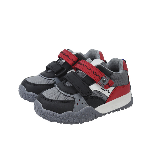Кроссовки Pasito для мальчика имеют серый основной цвет с яркими вставками. Оранжевые, белые и черные элементы добавляют динамики внешнему виду. Верх сделан из искусственной кожи, она устойчива к повреждениям и проста в уходе. Две липучки позволяют быстро надевать и снимать обувь.