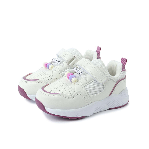 Аккуратные полуботинки типа кроссовки для девочек ясельного возраста. Обувь белого цвета с розовыми вставками и декоративными пластмассовыми бусинами в районе шнурков. Для верхней части использовали текстиль и искусственную кожу. Внутри ботинок мягкая и дышащая ХБ ткань с примесью полиэстера.