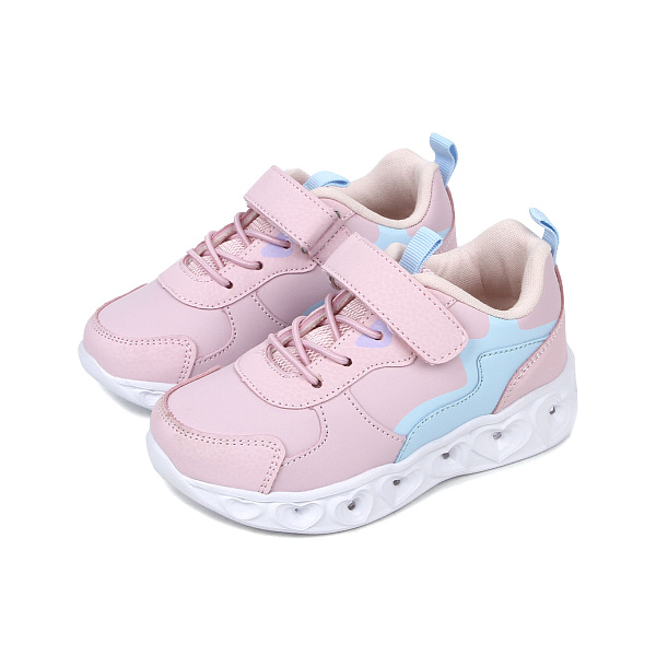 Кроссовки прекрасно подходят активным детям, любящим подвижные игры на воздухе. Застежка комбинированная – на шнурках и липучке. Цвет - розовый с голубыми вставками на бортах. На боковой поверхности подошвы расположены световые элементы, которые мерцают при ходьбе.