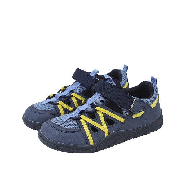 Сандалии Pasito для мальчика имеют спортивный вид. Основной цвет — синий, дополненный яркими желтыми деталями. Верх выполнен из искусственной кожи и текстиля. Закрытый мысок и пятка снижают риск травм при движении по неровной поверхности. Ремешок на липучке позволяет легко регулировать посадку.