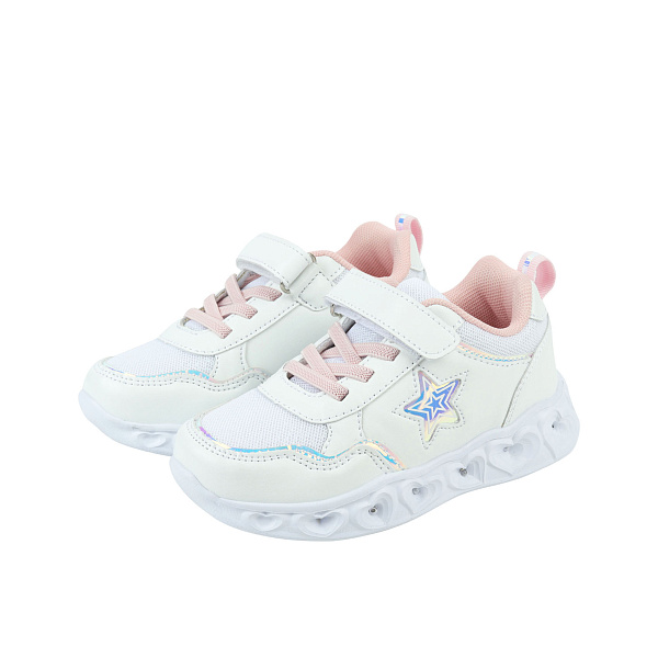 Для комфортных прогулок ребенку подойдут модные и красивые полуботинки кроссовочного типа. Верх изготовлен из текстиля и искусственной кожи, подкладка текстильная с флисовым утеплителем, стелька мягкая. Подошва толстая из полимерного материала ЭВА, который не утяжеляет ботинок и препятствует скольжению. Кроссовки завязываются шнурками, в верхней части голенища дополнительная застежка с липучкой, прикрывающая горловину. Задник закрытый. Цвет изделия белый, шнурки и подкладка розовые. Белая подошва дополнена светодиодами, которые ярко мерцают при ходьбе.