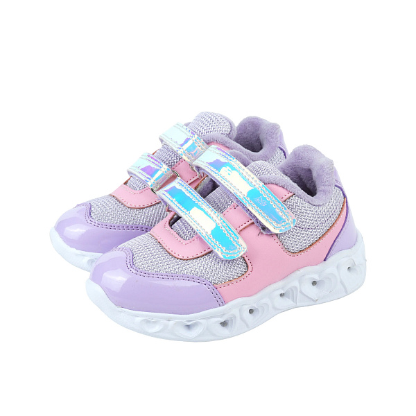 Для прогулок и активных игр на свежем воздухе отлично подойдут модные кроссовки лавандового цвета. Верх обуви изготовлен из текстиля и кожи, а подкладка – из 100% текстиля. Подошва толстая из полимерного материала ЭВА, который не утяжеляет ботинок и препятствует скольжению. Стелька мягкая, изготовлена из текстиля, она сохраняет тепло и дарит сухость ногам. Кроссовки легкие, они не утомляют ногу и не натирают кожу. Задник закрытый. Застегиваются полуботинки двумя застежками с липучками, такую обувь можно надеть быстро и легко. Цвет кроссовок – розовый, носок и задник – лавандовые. Белая подошва дополнена светодиодами, которые ярко мерцают при ходьбе.