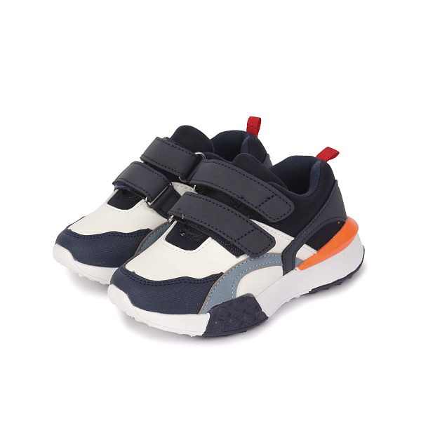 Детские полуботинки типа кроссовки для мальчиков дошкольного возраста. Модель выглядит ярко благодаря сочетанию нескольких контрастных оттенков: белого, синего, голубого и оранжевого. У ботинок удобная застежка в виде липучек. Она помогает облегчить и ускорить процесс переобувания ребенка. А жесткая пятка фиксирует детскую стопу в правильном положении.