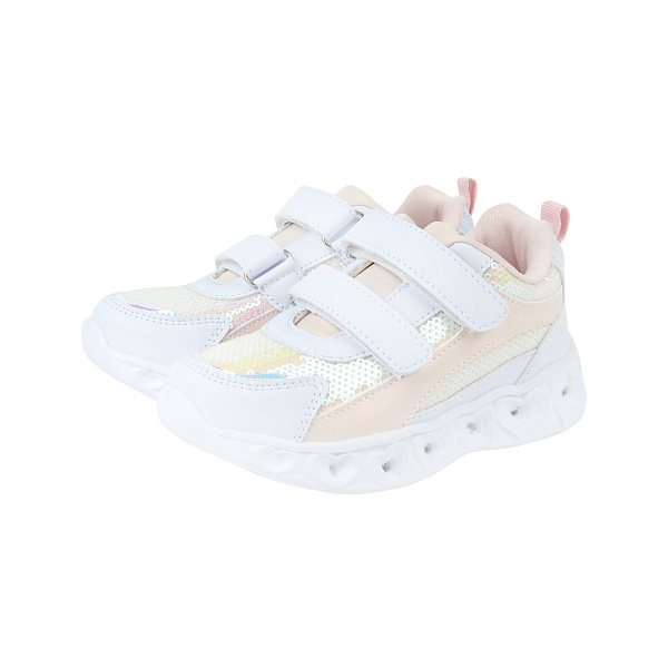 Вставки из искусственной кожи розовых и белых оттенков гармонично сочетаются с текстильными элементами верха кроссовок. Пайеточные детали добавляют изделию блеск и перелив оттенков розового цвета. Благодаря удобным застежкам-липучкам кроссовки легко надевать и снимать.
