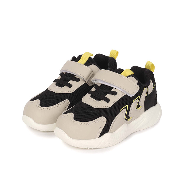 Удобный вариант обуви для мальчиков на каждый день – это классические полуботинки типа кроссовки. Основной цвет модели – бежевый с декоративными контрастными черными и желтыми элементами. Застежки на липучке позволяют быстро переобуть ребенка на прогулку или с нее. А плотная пятка фиксирует стопу в правильном положении.