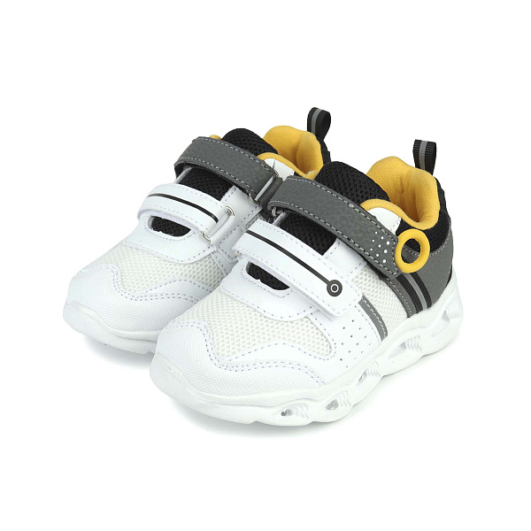 Кроссовки Pasito с сеткой с желтыми элементами подошва с огоньками бело-серые