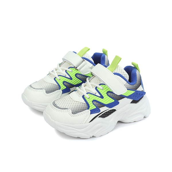 Стильные полуботинки типа кроссовки для мальчиков дошкольного возраста. Изделие выполнено в белом цвете с яркими синими и зелеными вставками. У обуви два типа застежек: шнурки и липучка, надежно фиксирующие ботинки на ноге.