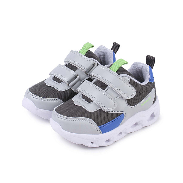 Кроссовки для детей ясельного возраста выполнены в стильном сером цвете с яркими голубыми и зелеными акцентами, придающими обуви современный и привлекательный вид. Верхняя часть сочетает текстиль и искусственную кожу, обеспечивая прочность и комфорт в носке.
