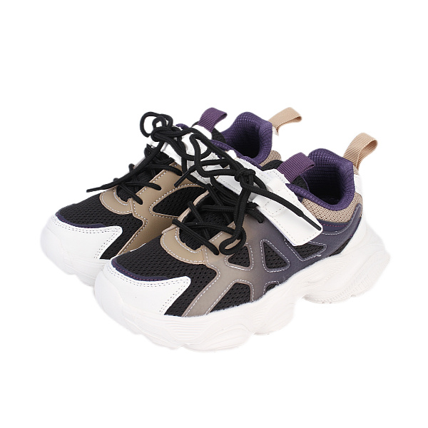 Кроссовки для мальчиков выполнены в ярком мультиколорном дизайне, который сочетает в себе черные, бежевые и фиолетовые оттенки, создавая стильный и модный образ. Верхняя часть из текстиля, искусственной кожи и ТЭП обеспечивает прочность и вентиляцию, что делает обувь идеальной для активных прогулок и игр.