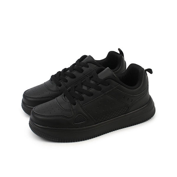Кроссовки для мальчика выполнены в черном цвете с лаконичным и строгим дизайном. Модель имеет классическую форму с аккуратной шнуровкой и небольшой перфорацией на носке для декора. Подошва ровная и немного приподнятая, создает спортивный и универсальный образ. Обувь смотрится аккуратно и подходит для повседневной и школьной носки. Минималистичный стиль делает кроссовки подходящими под любой школьный наряд.