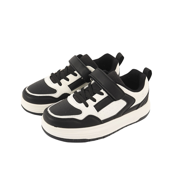 Современные детские кроссовки для мальчиков-школьников выполнены в сочетании черного и белого цветов. Верх изделия изготовлен из искусственной кожи, что обеспечивает долговечность и легкость в уходе. Чёрные и белые акценты придают обуви свежий и элегантный вид, подходящий для повседневного ношения и в качестве сменной обуви.