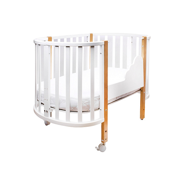 Белая кровать «Энни» имеет необычную и стильную форму. Две ножки кровати оснащаются колесами с тормозной системой, с помощью которых ее можно катать по комнате, чтобы укачать ребенка и еще две – пружинами. Высокие перила кровати из белого бука имеют полукруглую форму. С передней стороны находится небольшое возвышение в форме облака и перила, которые можно поднимать и опускать с помощью кнопок, так что ребенок не сможет выпасть из нее по мере роста. Высокий овальный матрас мягкий и комфортный, он предназначается как раз для малышей, поэтому обладает ортопедическими и гипоаллергенными свойствами. Размеры ложа кровати – 70х125см.