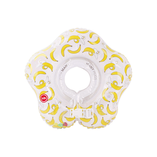 Круг на шею с рисунком банана легко моется, а сам круг легко надуть или спустить. Защитные клапаны не дадут воздуху выйти из круга. Приспособление изготовлено из материала, безопасного для малышей. Для запаивания швов использована технология внутренней обработки швов, поэтому круг не натирает шею и не поранит ребенка. Круг подходит также для обучения малышей плаванию.