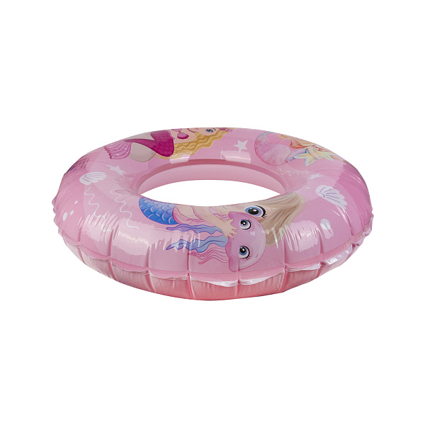 Надувной круг «Русалка» представляет собой детский аксессуар для плавания, выполненный в розовом цвете с принтом в виде веселых русалочек. Изображения персонажей расположены по всей внешней стороне круга, дополнены ракушками и звездами, создавая картину подводного королевства. Продукт изготовлен из прочного материала ПВХ, что обеспечивает его долговечность и безопасность в использовании.