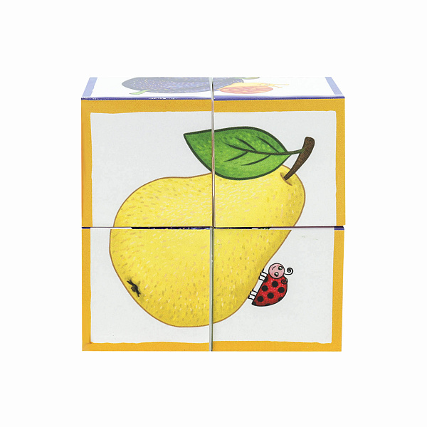 Набор развивающих кубиков «Фрукты да ягоды» предназначен для малышей с 2 лет. В красочной упаковке ребенок найдет 4 кубика размером 4х4см и 6 картинок-подсказок. Малышу предлагается сложить картинку из 4 фрагментов. На карточках изображены картинки фруктов, которые помогут быстрее решить задачу. Картинка-образец кладется на дно коробки, а ребенок ставит на нее нужные кубики.