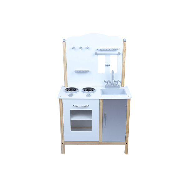 Деревянная кухня белого цвета – игровой набор для ребёнка от 3 лет. Изнутри и снаружи она выглядит как настоящий кухонный гарнитур. Благодаря уменьшенным размерам кухни малыш сможет попробовать себя в роли повара. Комплект состоит из кухонной плиты, тумбы, имитации шкафчика и полочек. В наборе также разноцветная кукольная посуда. На поверхности столешницы размещены игрушечная раковина и спиральки, они имитируют газовые конфорки. Игрушка не содержит мелких деталей. Съемные элементы выполнена из цветного или окрашенного пластика и полностью безопасны для ребёнка.