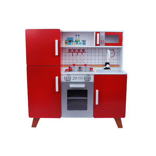 Игрушка «Кухня» копирует изысканный дизайн современных кухонных гарнитуров. Изготовлен комплект из дерева с пластиковыми деталями, цветовая гамма – красная.