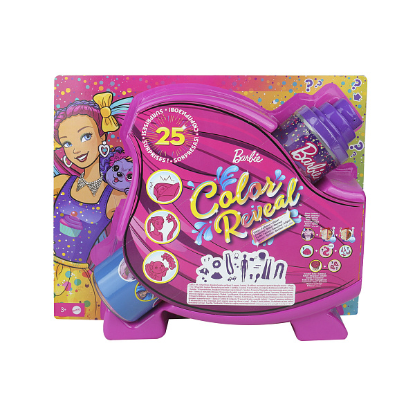 Помимо Barbie, в комплекте еще 25 сюрпризов в виде одежды, аксессуаров, блесток и 10 накладных разноцветных прядей. В набор также входит очаровательный маленький питомец.