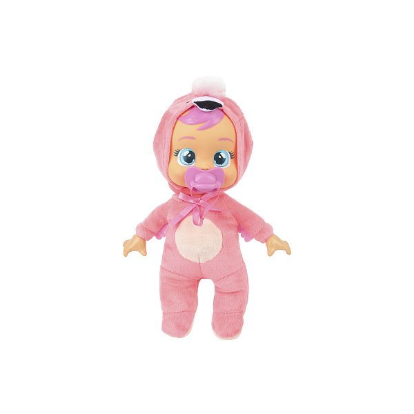 Игрушка одета в плюшевую пижаму розового цвета, внешне напоминающая фламинго. Капюшон украшает вышивка в виде морды и клюва, а также объемный пушистый хохолок. Продается вместе с пластиковой соской.