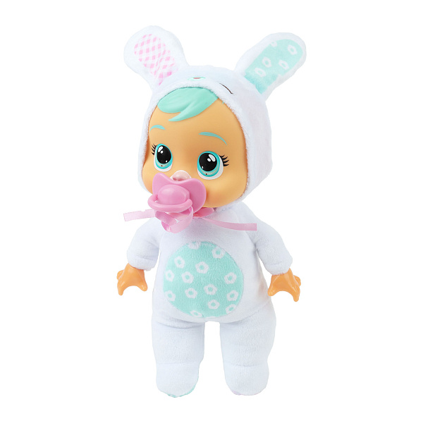 У малышки голубые волосы и мягкий белый костюм с длинными ушками на капюшоне. В комплект входит соска розового цвета, которая поможет успокоить малышку. Ее приятно обнимать, можно брать с собой спать, в гости или на прогулки.