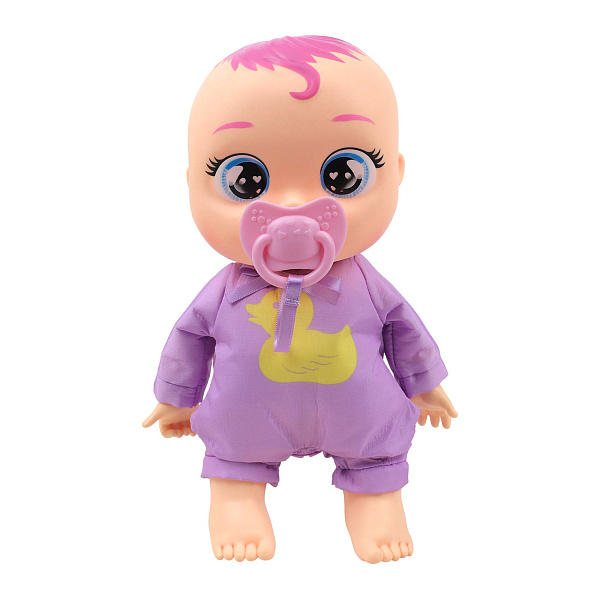 Кукла Зои из серии Cry Babies высотой 29 см одета в фиолетовый халатик с желтой уточкой и дополнена мягким желтым полотенцем на голове. Её большие глаза, пустышка и нежные черты лица создают образ милого малыша, готового к игре в купание.