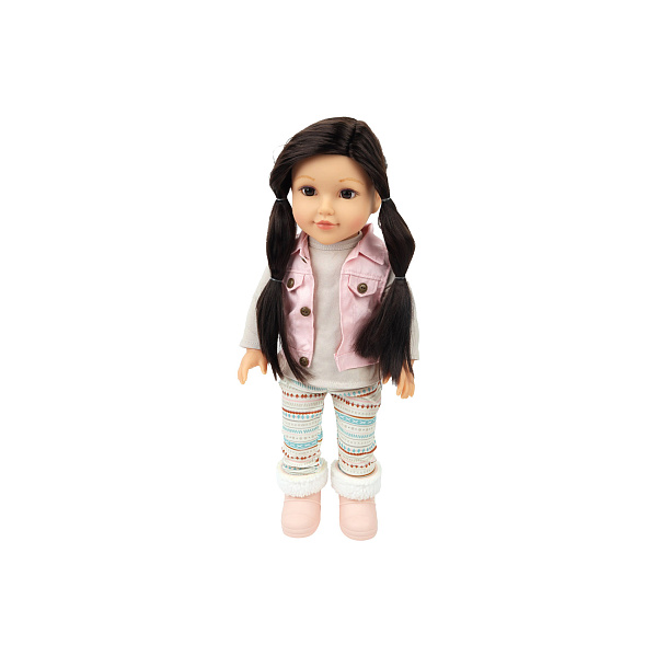 Эта модница понравится девочкам 3 лет и старше. Кукла одета в светлую водолазку, лосины в поперечную полоску и укороченную джинсовую куртку розового цвета. Длинные темные волосы собраны в хвосты. Большая кукла с мягким телом похожа на ребенка. Девочки с удовольствием будут придумывать новые сюжеты для игр с ней. Куклу можно переодевать, кормить, причесывать, брать на прогулку.