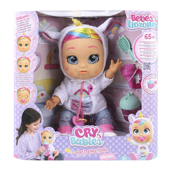 Кукла «Cry Babies» из серии «Первые эмоции» представляет собой уникальную игрушку, способную демонстрировать реалистичные эмоции. Большие выразительные глаза и мягкие черты лица делают ее особенно очаровательной. Наряд в виде белого костюма с капюшоном, украшенным изображениями единорогов, добавляет игрушке сказочности и яркости.