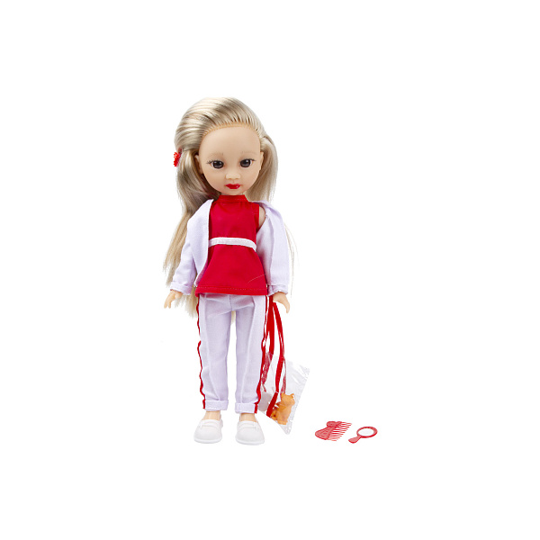 Кукла «Элис на шоппинге» станет для девочек верной подругой и модным стилистом. Отличается модным нарядом в летних тонах белого и красного. Элис одета в легкую куртку, футболку без рукавов с завышенной талией, брюки с подворотами, мокасины. Настоящий образец стиля модницы! Дополнен образ прозрачной сумкой с питомцами, расческой, зеркалом. Сама кукла отличается красотой – карие глаза, алые губы, приятные черты лица, длинные белые волосы, которые можно убирать в прически.
