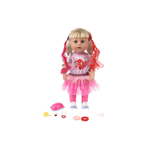 Кукла-малышка с 7 интерактивными функциями будет интересна детям с 4 лет. Она станет настоящей подружкой, надолго завладеет вниманием ребенка. В набор входят заколки, пара из которых дополнена цветными прядками, резинки, расческа, браслеты. Гибкие конечности позволяют зафиксировать игрушку в любом положении.