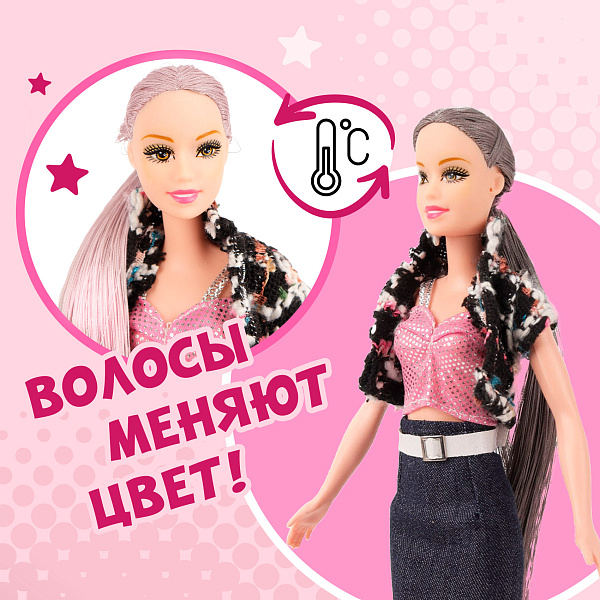Это стильная игрушка, которая привносит элементы волшебства в игру благодаря возможности изменения цвета волос при понижении температуры до 31°C. Кукла одета в модный наряд, состоящий из розовой блестящей майки, синей юбки и стильного жакета с черно-белым рисунком. Образ дополняется длинными волосами, которые меняют цвет, позволяя создавать уникальные прически и стили. Эта кукла способствует развитию у ребенка воображения и креативности, стимулируя придумывать новые сюжеты и ролевые игры. Особенность изменения цвета волос делает каждую игру увлекательной и неповторимой. Родители оценят игрушку за её способность длительное время удерживать внимание ребенка, развивая мелкую моторику и навыки ухоженности.