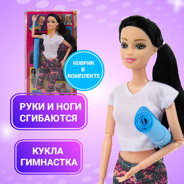 Кукла подружка модница гимнастка – образец для подражания юных будущих спортсменов. Футболка и бриджи создают спортивный образ. Одежда надежно прошита, поэтому куклу можно переодевать. Длинные черные волосы собраны в хвост. Их можно расплетать и создавать новые прически.