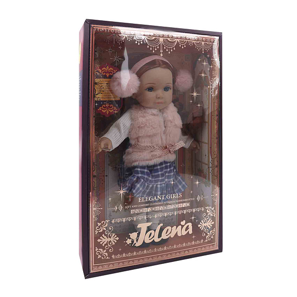 Кукла одета в белую кофту с длинными рукавами. На ней надет розовый меховой жилет с поясом в полоску. Сарафан синий, в клетку, с оборкой по низу. На голове — ободок с пушистыми помпонами розового цвета. Рыжие волосы заплетены в две косички. Ноги и руки подвижные. Подходит для сюжетно-ролевых игр.