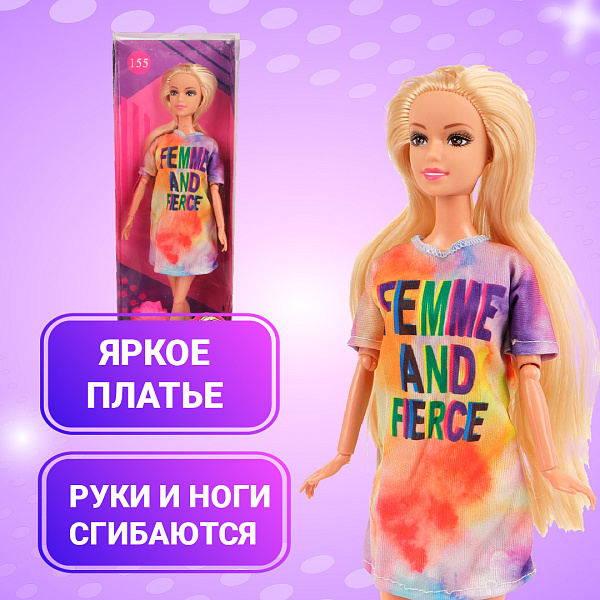 Кукла модельная — это стильная и современная игрушка, подходящая для игр и коллекционирования. Она обладает выразительными чертами лица, длинными волосами, которые можно расчесывать и заплетать в прически. Кукла одета в яркое платье, сочетающее разноцветные оттенки.