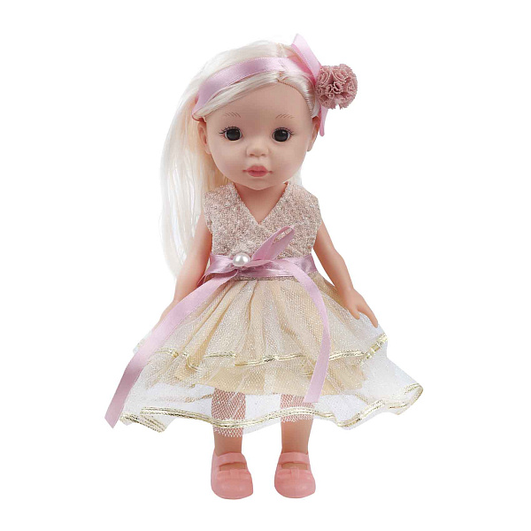 Кукла имеет светлые волосы. Прическа украшена изящной лентой с цветком. На кукле нарядное платье в золотисто-розовых тонах. На ногах куклы розовые туфли. Размер куклы составляет 26 сантиметров. Все части тела куклы сделаны из пластика. Руки и ноги являются подвижными. Конечности не сгибаются в локтях и коленях. Материал является прочным и безопасным.