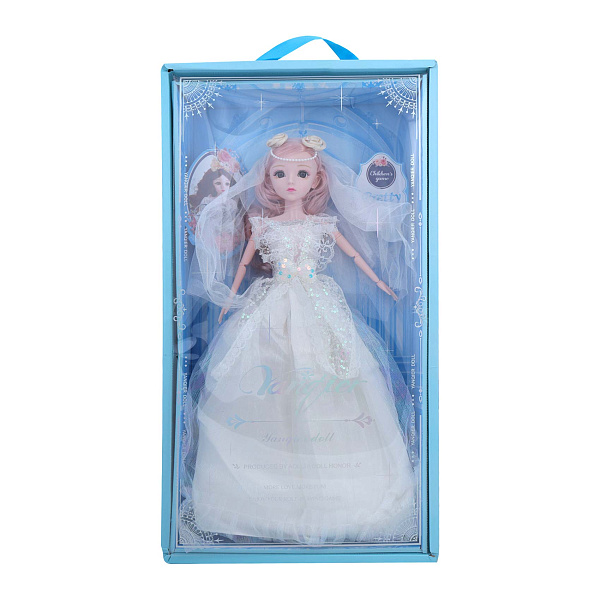 Кукла классическая «Невеста» высотой 62 см — это изящная шарнирная игрушка. Кукла одета в роскошное свадебное платье белого цвета с кружевами и блёстками, а её розовые волнистые волосы украшены нежными цветами и жемчужной цепочкой. Лёгкая фатиновая фата придаёт образу нежность и утончённость.