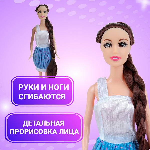 Кукла станет новой подружкой в кукольном домике ребенка. Длинные каштановые волосы куклы пришиты к голове. Это понравится девочкам, которые любят ухаживать за кукольными волосами и создавать различные прически.