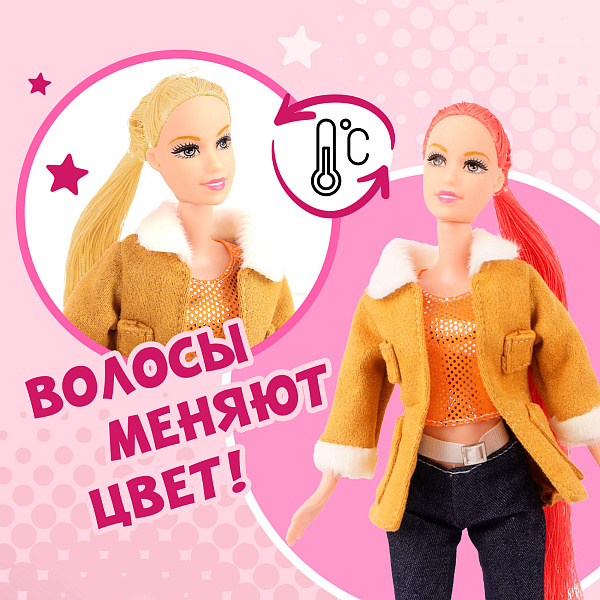 Кукла выделяется стильным внешним видом и уникальной возможностью изменения цвета волос при понижении температуры до 31°C. Кукла одета в оранжевую блестящую майку, синие джинсы и стильное кашемировое пальто горчичного цвета с белым меховым воротником и манжетами. Длинные рыжие волосы куклы ярко контрастируют с ее нарядом, придавая образу неповторимый шарм.