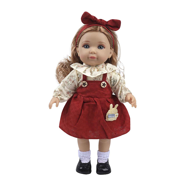 Кукла со светлыми волосами одета в нарядный комплект. Ее рост составляет 36 сантиметров. Этот размер удобен для детских рук. Основу образа составляет бордовый сарафан. Под сарафан надета блуза с мелким цветочным принтом. На ноги куклы надеты белые носки и черные туфли. Прическу украшает повязка с бантом.