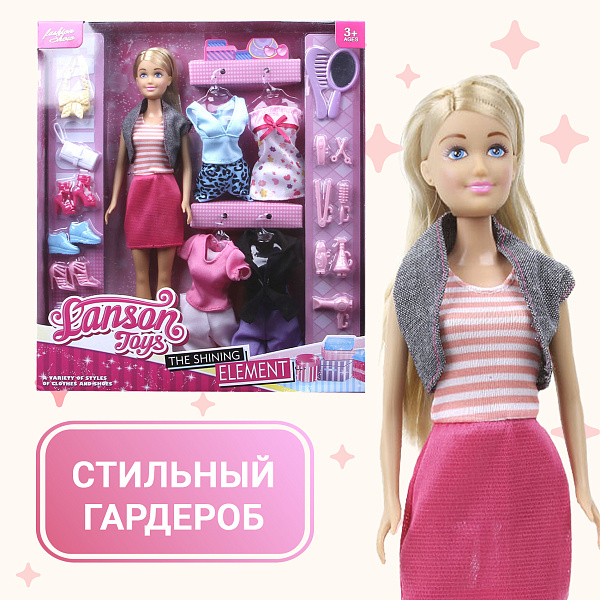 Игровой набор Lanson Toys порадует каждую девочку обилием нарядов и аксессуаров. В комплект входит кукла, гардероб с полками, 4 дополнительных комплекта одежды, обувь к ним, головные уборы, сумочка, фен, зеркало, расческа, щипцы для укладки волос. С таким арсеналом ребенок надолго займется увлекательной игрой.