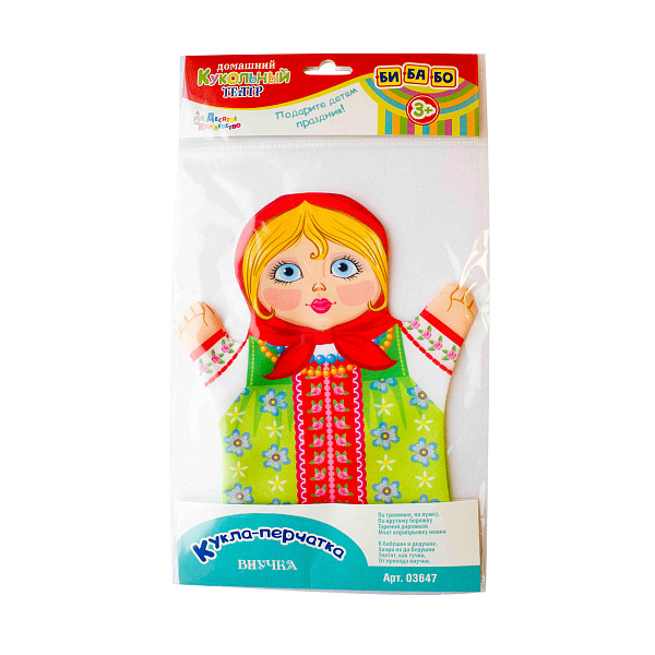 Кукла-перчатка в виде заботливой внучки понравится каждому малышу с 3лет. Его заинтересует оригинальная игрушка, поднимет настроение и развлечет. Чуть позже ребенок самостоятельно начнет придумывать и воплощать в жизнь небольшие театральные постановки. Это увлекательно и полезно для развития детей: активируется моторика рук, улучшается координация движений, развивается воображение, логическое мышление, речь и память.