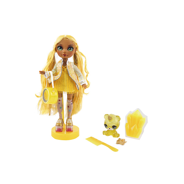 Малышка одета в легкое желтое платье с блестками, куртку в том же оттенке, расшитую пайетками, гольфы с разноцветными звездами и золотые ботинки на платформе. В руках у модницы оригинальная круглая сумка. В наборе также есть расческа и любимый питомец куклы – медвежонок.