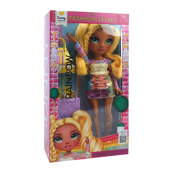 Кукла Санни из серии Rainbow High Entry Fashion высотой 27 см одета в наряд с блестящей юбкой и цветным топом, дополненный аксессуарами. Её длинные светлые волосы, собранные в косы, и выразительные глаза подчеркивают её яркий и жизнерадостный образ.