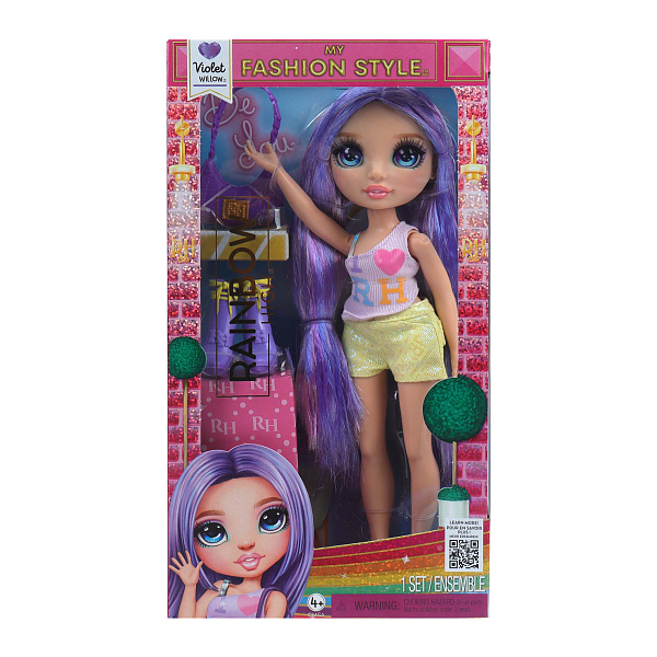 Кукла Виолет из серии Rainbow High Entry Fashion высотой 27 см одета в яркий наряд с блестящими шортами и топом с сердечком. Её длинные фиолетовые волосы и выразительные глаза подчеркивают её стильный и современный образ, соответствующий тематике коллекции.