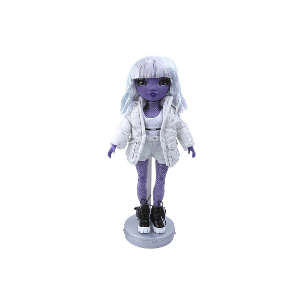 Яркая кукла Rainbow High Shadow Диа Манте приковывает к себе внимание с первых минут знакомства. Фиолетовая кожа эффектно сочетается с белыми волосами и комплектом одежды и аксессуаров им в тон. У этой модницы есть свой стиль, и она точно знает, как необычно одеться на любое мероприятие.